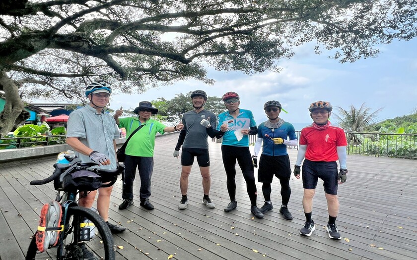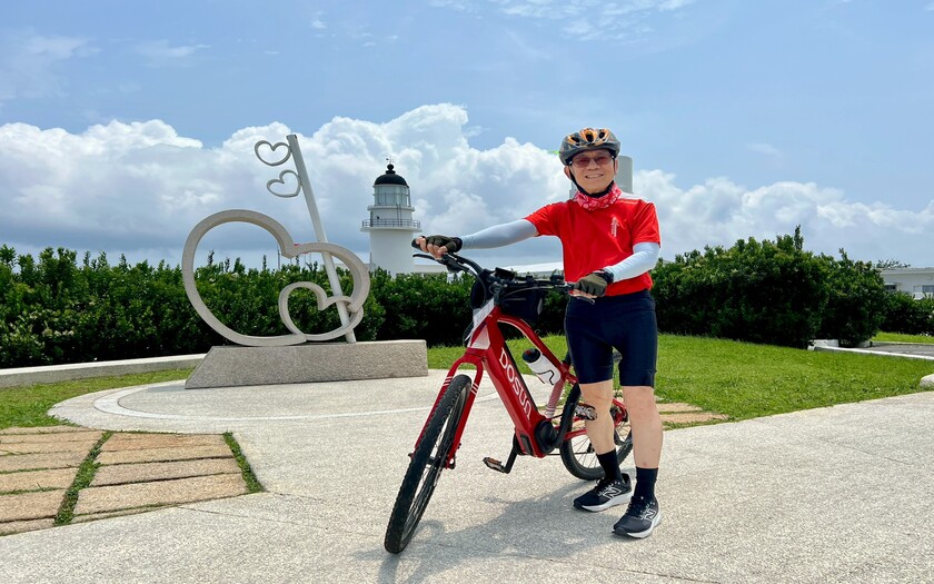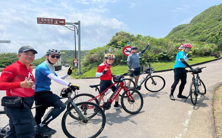 出了隧道,迎面而來的是今天第一個考驗——三貂角燈塔的爬升。短短150公尺的高度,卻毫不客氣。對剛接觸單車不久的夥伴來說,每一踩都是挑戰;有人騎一般車,有人第一次嘗試電輔車,緊張與期待交錯。但沒有退縮,沒有放棄,一步一步,大家終於站上燈塔前的平台。眼前海天一線,白色燈塔在藍天映襯下格外耀眼,那一刻的成就感,比任何距離都更深刻。