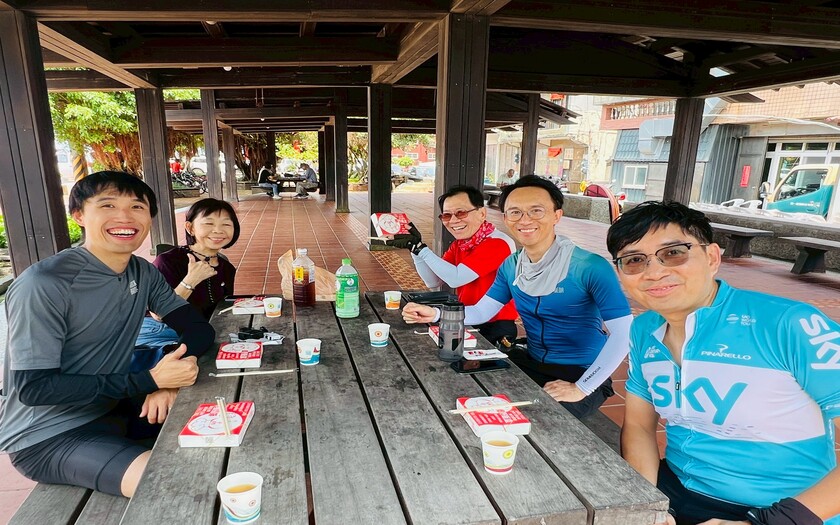 下滑後經過外澳,海風迎面而來,節奏重新放鬆。中午抵達福隆東興宮,簡單卻經典的福隆便當成了最佳補給。大家坐在涼亭裡,望著海景,邊吃邊聊,山海戀準備的咖啡在玻璃小杯中散發香氣,這頓午餐,不只是補給,更像一段帶著溫度的停留。